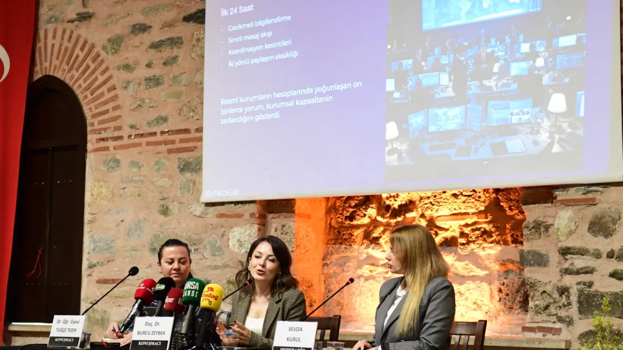 BURSA (İGFA) - Bursa'da Ördekli Kültür Merkezi'nde Sevda Kurul'un moderatörlüğünde düzenlenen programda, alanında uzman isimler bilgi ve deneyimlerini katılımcılarla paylaştı. Doç. Dr. Burcu Zeybek, 'Afet ve Deprem Sürecinde İletişim ve Dezenformasyon' başlıklı sunumuyla, kriz anlarında doğru bilginin hayati önemini vurguladı.