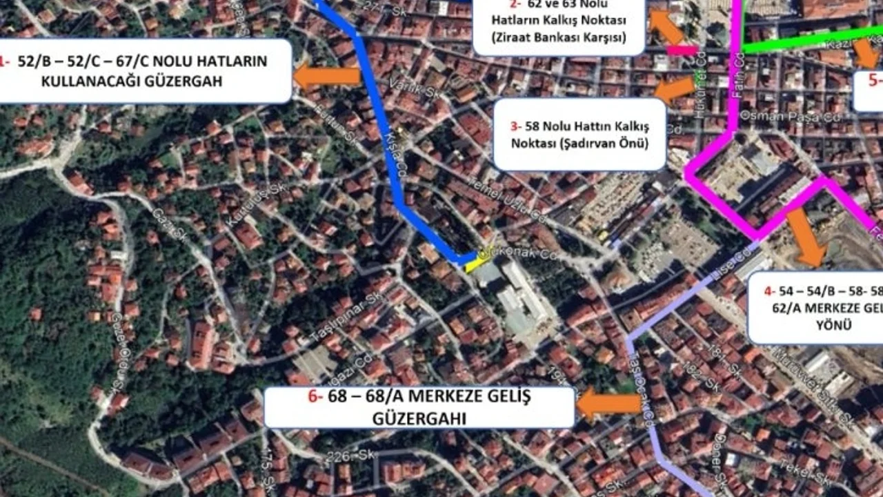 52/B, 52/C ve 67/C numaralı hatlar Atatürk Bulvarı - Kışla Caddesi - Eski Valilik güzergahını kullanacak.